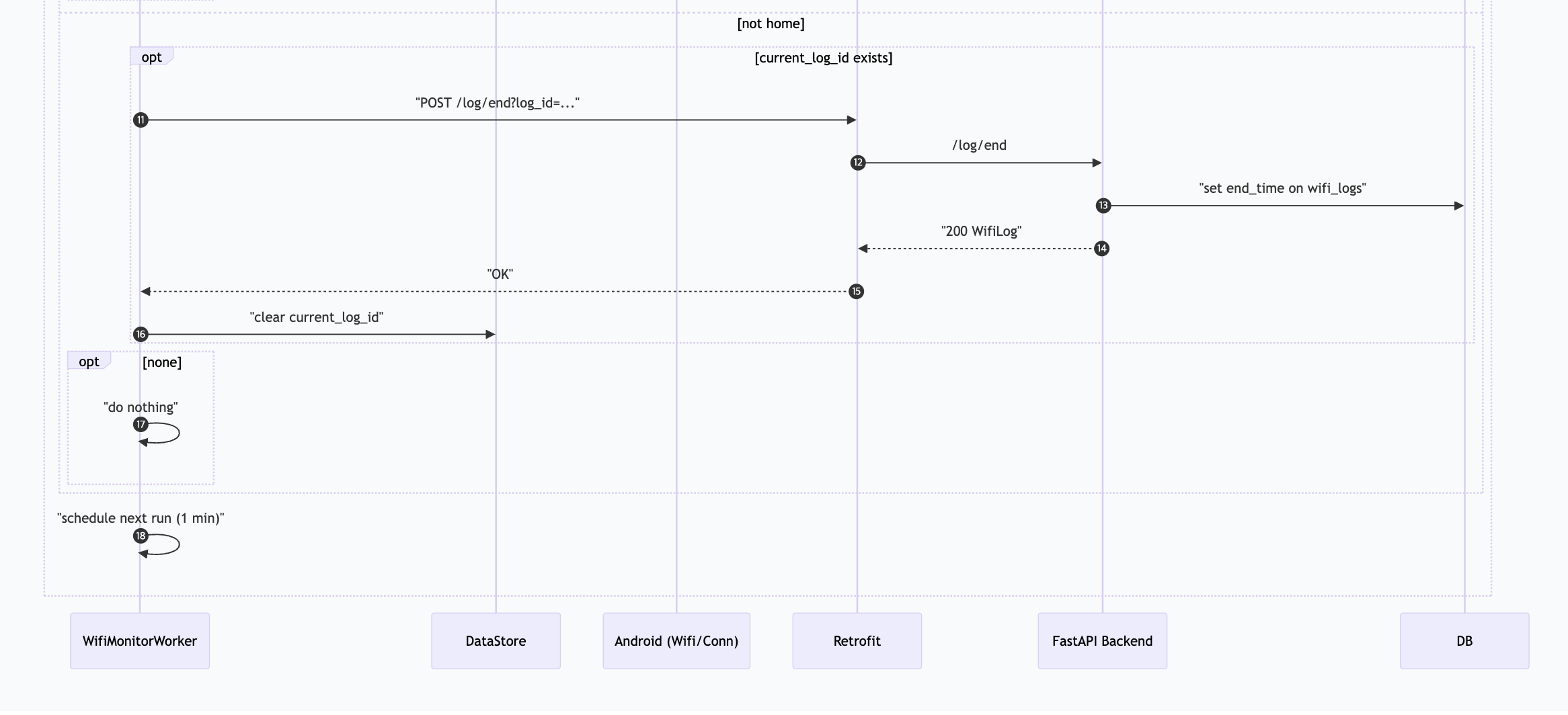 worker에서 사용자의 현재 user_id와 현재의 log_id를 지속적으로 불러온다 이후 1분마다 wifi 연결여부를 확인한 후 연결되어 있는 wifi와 저장된 wifi의 정보가 같을 경우 체류중으로 인식하여 log/start(체류 기록 시작)을 하게 된다