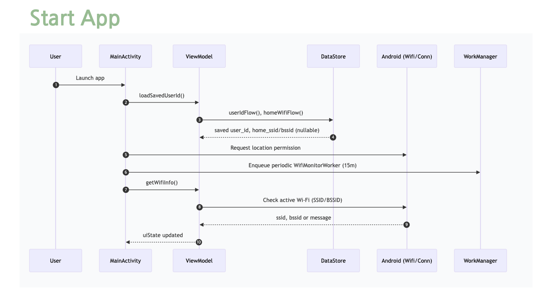 앱이 시작되면 기기에서 저장되어있는 user_id를 불러오고, user_id가 있다면 해당하는 wifi의 ssid와 bssid를 불러온다